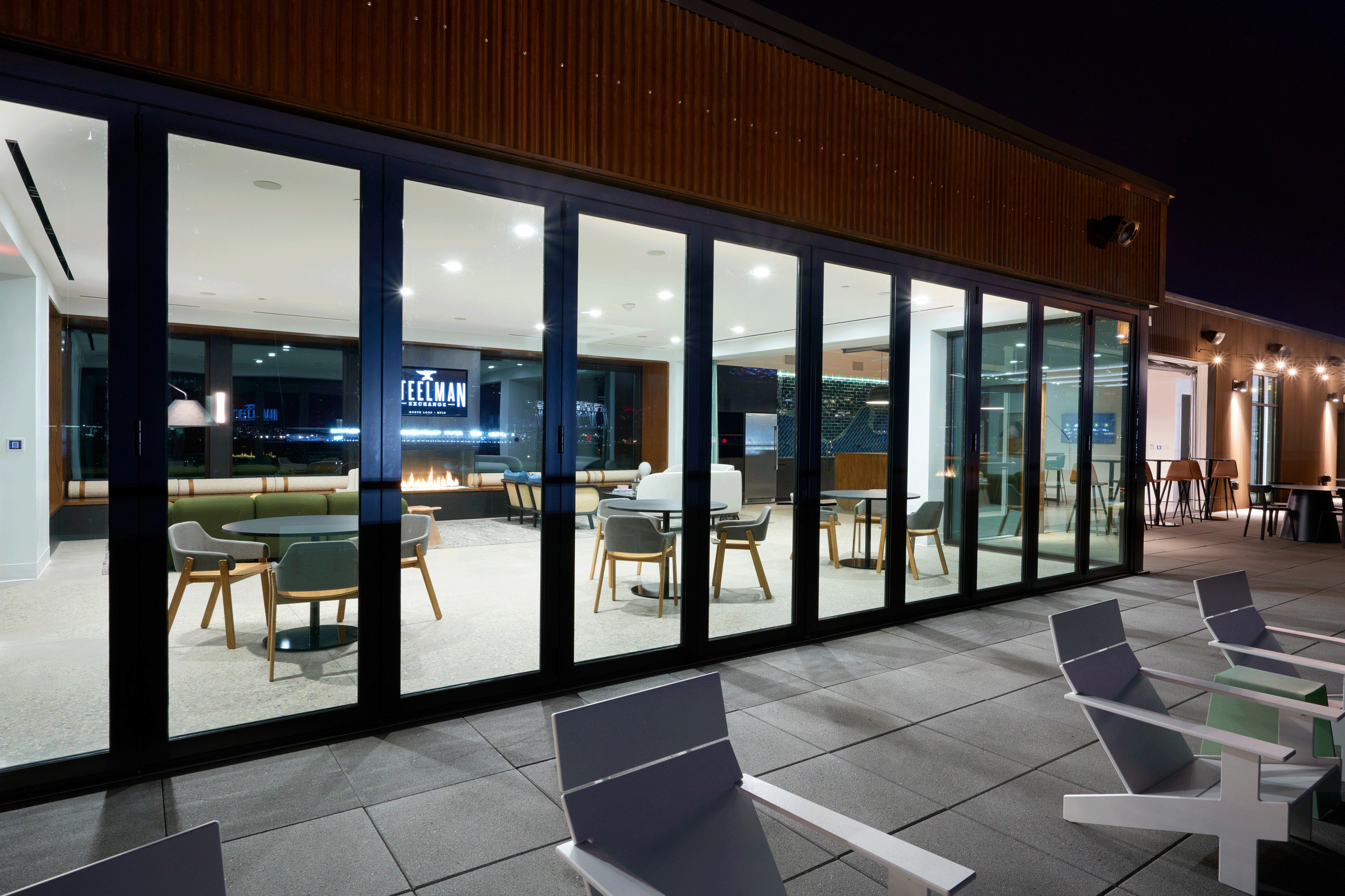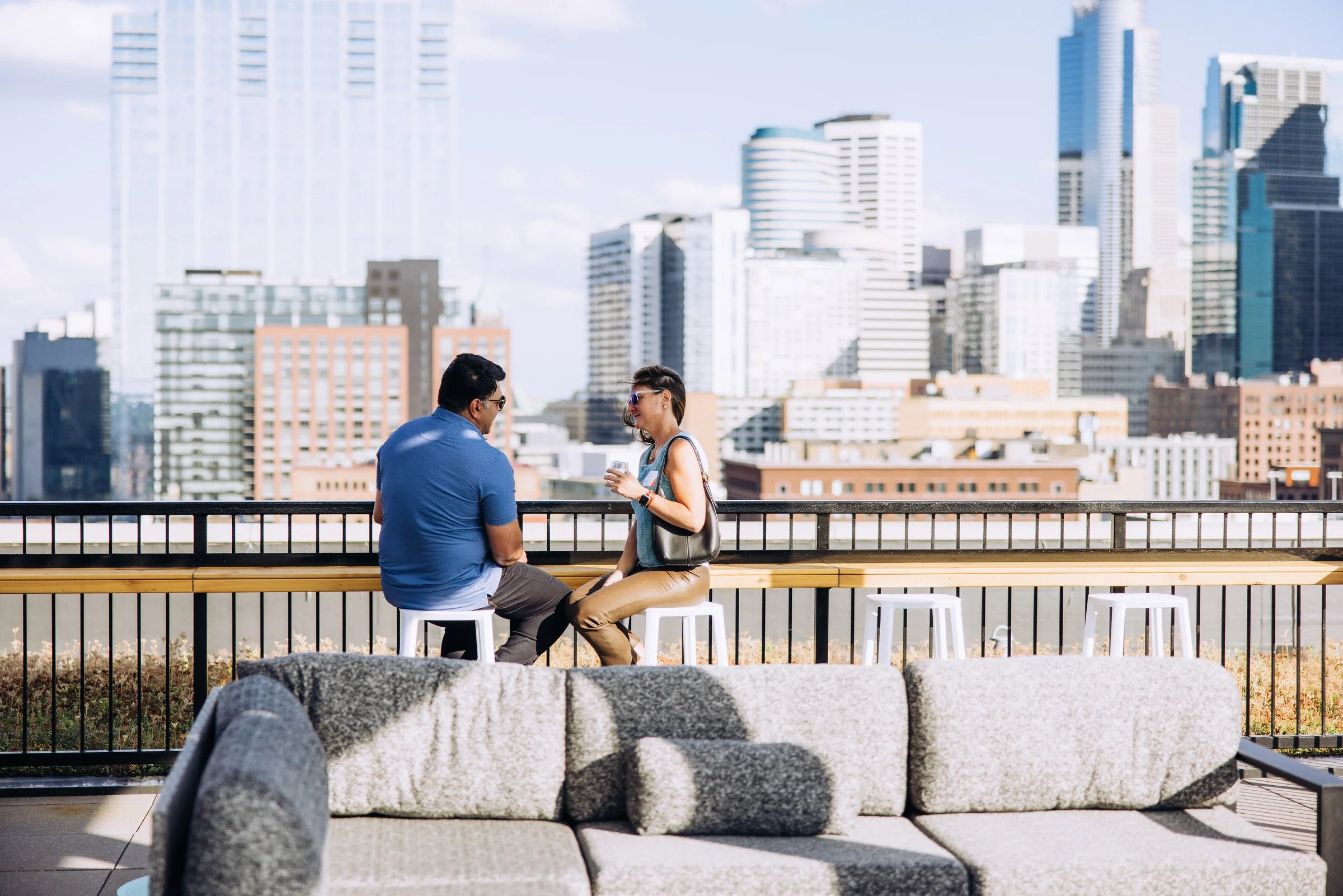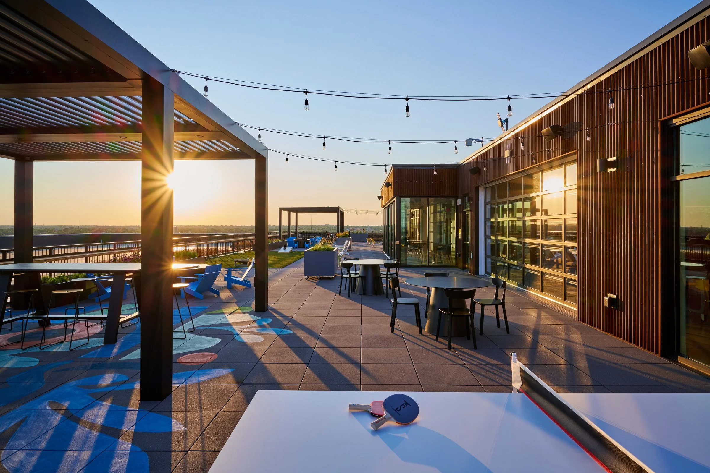 By inserting a new infill building between two existing structures on the rooftop, the design team created a full tenant lounge full of natural light and set against the backdrop of Minneapolis skyline. Now, arriving at the rooftop feels like an elevated experience. Outside, a blend of playfully painted paved areas, a new lawn area, planting trays, new pergola structures, fire pits, a continuous drink rail, and movable planters on the roof deck, create opportunities for a variety of gatherings and uses.