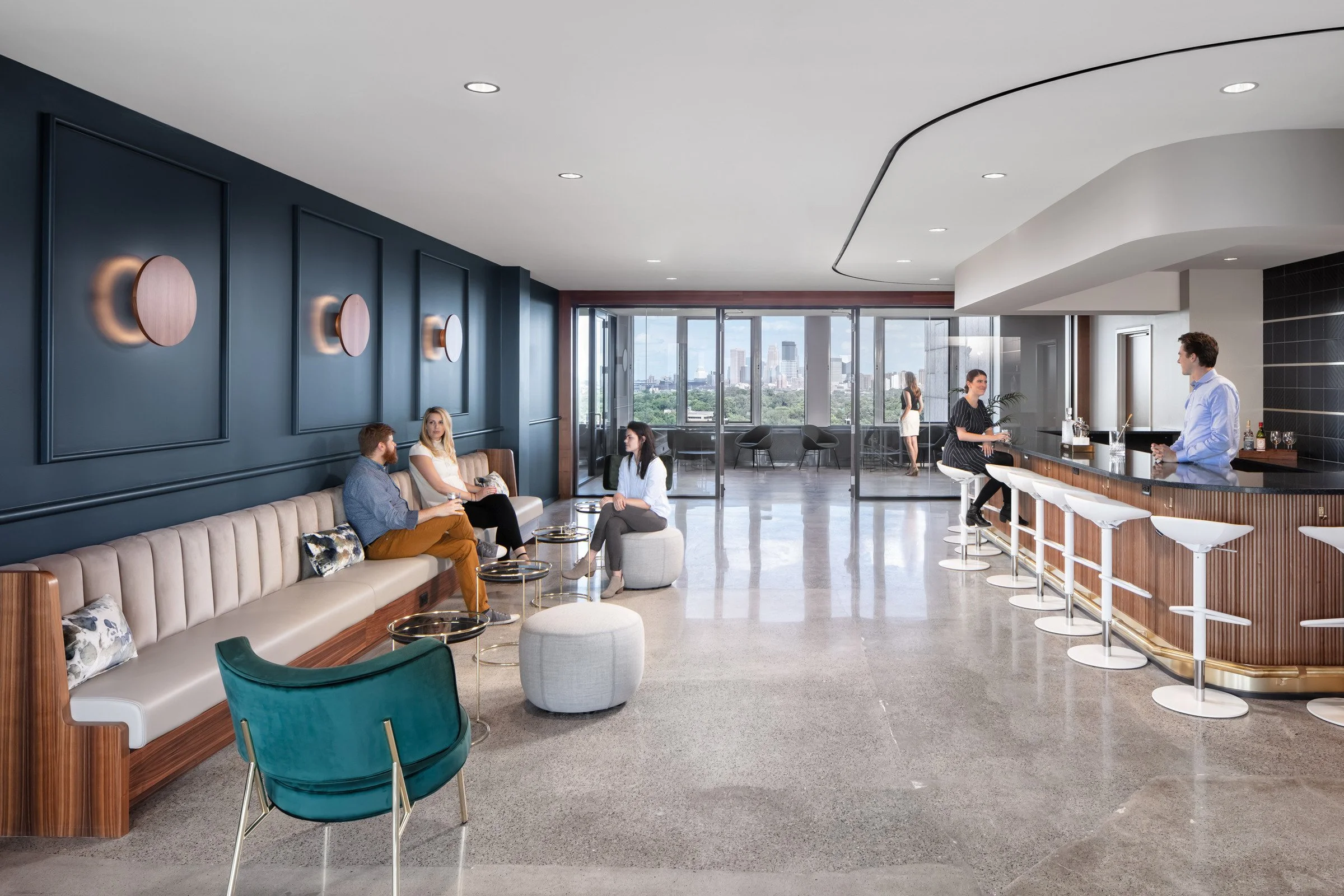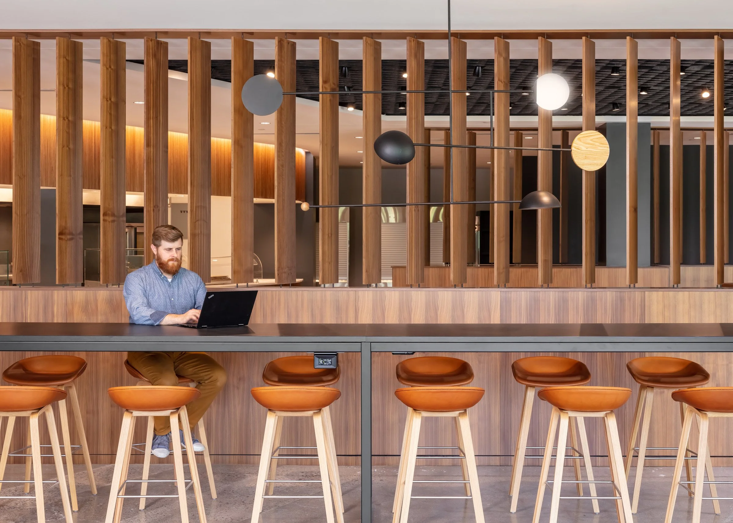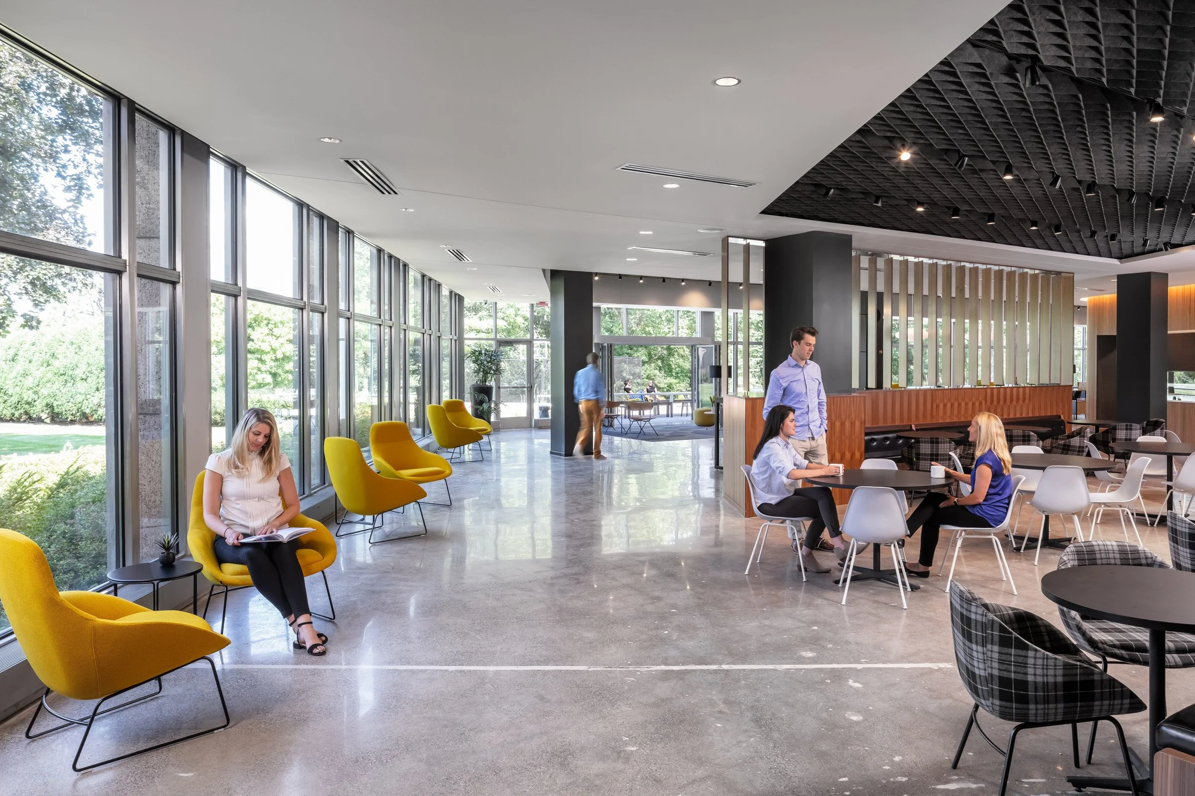 Social spaces were inserted throughout the building to create a resilient community environment. A farm-to-table café anchors the first-floor work lounge and training center. A 40’ long community table is set against a backdrop of operable glass walls that allow direct access to nature and new patio. The 8th floor clubhouse offers another venue to meet, relax and host events.
